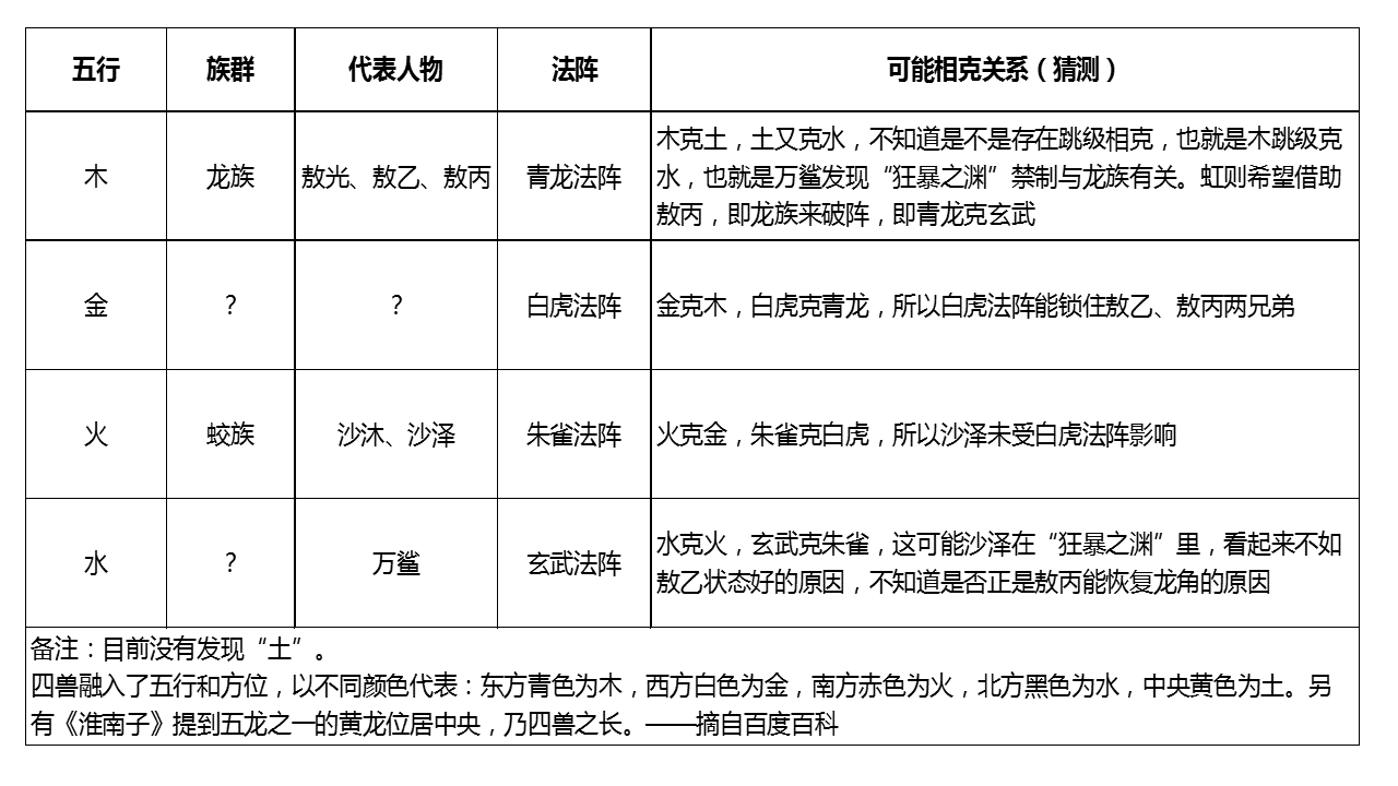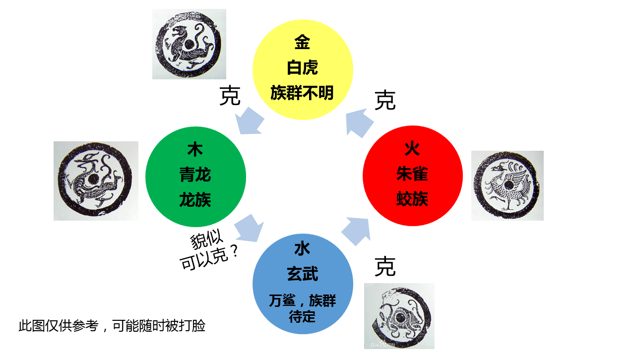 同时,之前我们分析过,中国古代神话中的天之四灵源于远古星宿崇拜,青龙五行主木,朱雀五行主火,白虎五行主金,玄武于五行主水。传统五行学说有个相克相生,其次序是金克木、木克土、土克水、水克火、火克金,四灵的法阵,也存在相克。现在就差玄武,准备凑一桌打麻将了~